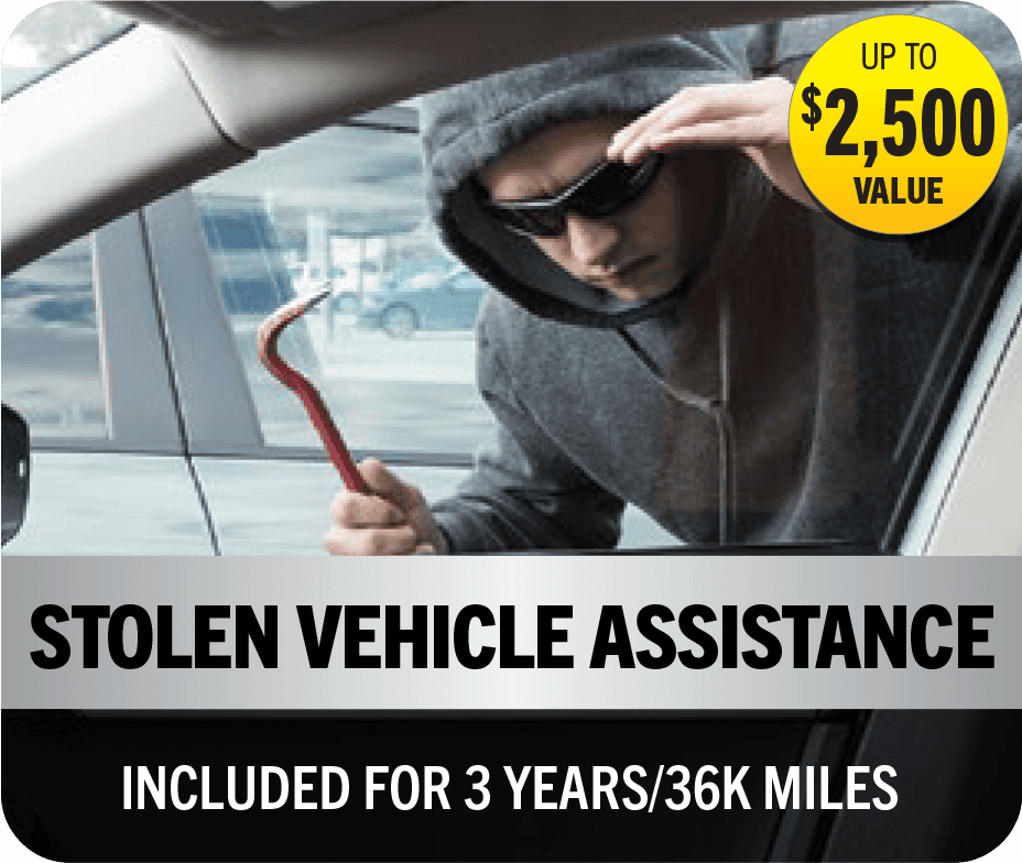 If your vehicle is stolen and declared a total loss we will cover your insurance deductible up to $2,500 as a credit toward a replacement vehicle at our dealership. Included as a loyalty benefit for 3 years or 36,000 miles.