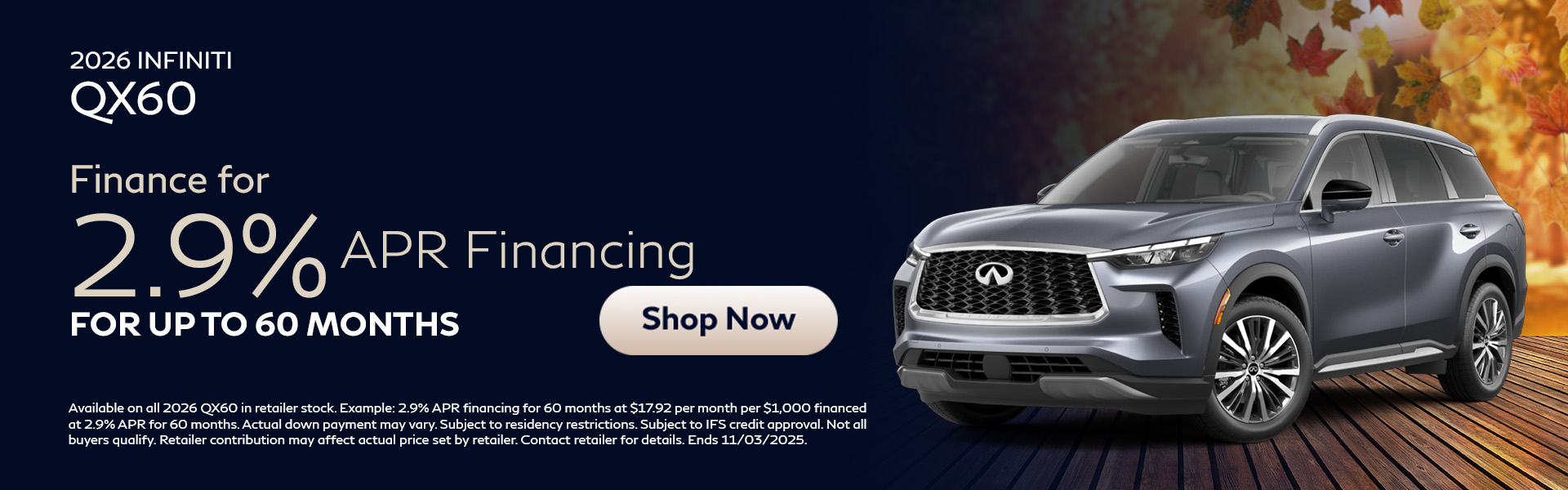 Available on all 2026 QX60 in retailer stock. Example: 2.9% APR financing for 60 months at $17.92 per month per $1,000 financed at 2.9% APR for 60 months. Actual down payment may vary. Subject to residency restrictions. Subject to IFS credit approval. Not all buyers qualify. Retailer contribution may affect actual price set by retailer. Contact retailer for details. Ends 11/03/2025.