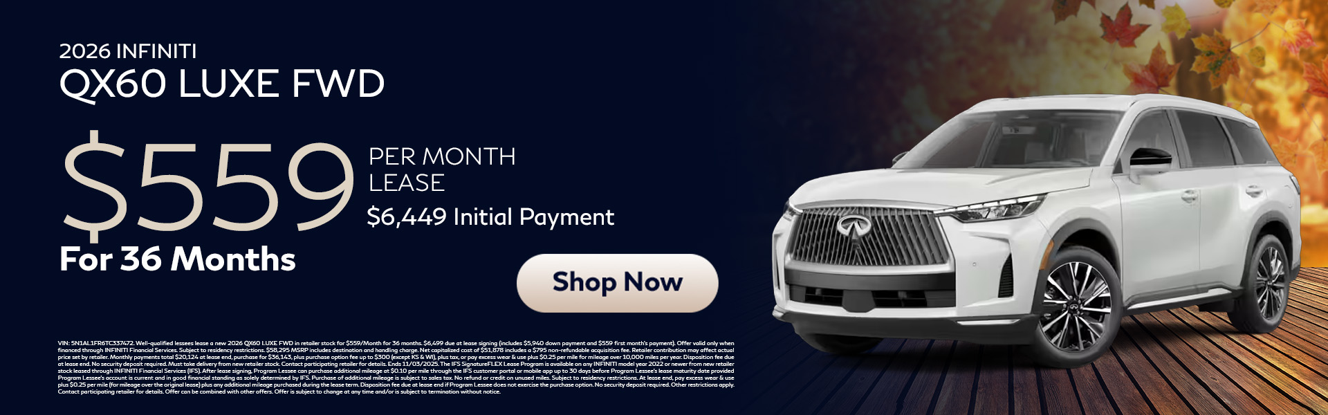 VIN: 5N1AL1FR6TC337472. Well-qualified lessees lease a new 2026 QX60 LUXE FWD in retailer stock for $559/Month for 36 months. $6,499 due at lease signing (includes $5,940 down payment and $559 first month's payment). Offer valid only when financed through INFINITI Financial Services. Subject to residency restrictions. $58,295 MSRP includes destination and handling charge. Net capitalized cost of $51,878 includes a $795 non-refundable acquisition fee. Retailer contribution may affect actual price set by retailer. Monthly payments total $20,124 at lease end, purchase for $36,143, plus purchase option fee up to $300 (except KS & WI), plus tax, or pay excess wear & use plus $0.25 per mile for mileage over 10,000 miles per year. Disposition fee due at lease end. No security deposit required. Must take delivery from new retailer stock. Contact participating retailer for details. Ends 11/03/2025. The IFS SignatureFLEX Lease Program is available on any INFINITI model year 2022 or newer from new retailer stock leased through INFINITI Financial Services (IFS). After lease signing, Program Lessee can purchase additional mileage at $0.10 per mile through the IFS customer portal or mobile app up to 30 days before Program Lessee’s lease maturity date provided Program Lessee’s account is current and in good financial standing as solely determined by IFS. Purchase of additional mileage is subject to sales tax. No refund or credit on unused miles. Subject to residency restrictions. At lease end, pay excess wear & use plus $0.25 per mile (for mileage over the original lease) plus any additional mileage purchased during the lease term. Disposition fee due at lease end if Program Lessee does not exercise the purchase option. No security deposit required. Other restrictions apply. Contact participating retailer for details. Offer can be combined with other offers. Offer is subject to change at any time and/or is subject to termination without notice.