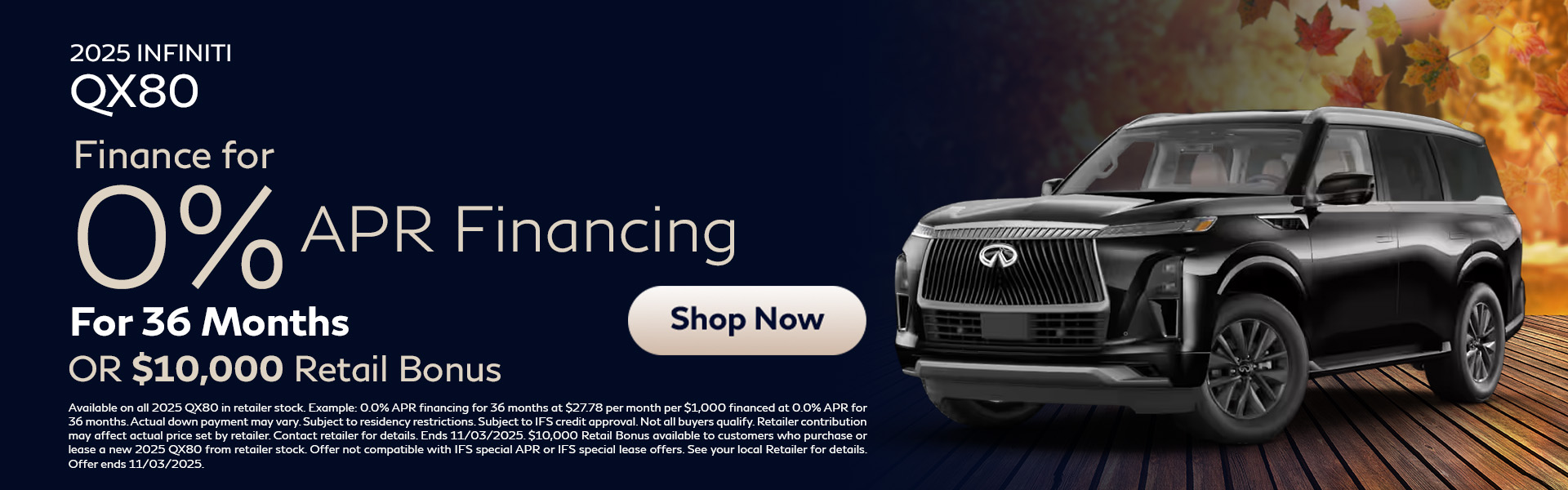 Available on all 2025 QX80 in retailer stock. Example: 0.0% APR financing for 36 months at $27.78 per month per $1,000 financed at 0.0% APR for 36 months. Actual down payment may vary. Subject to residency restrictions. Subject to IFS credit approval. Not all buyers qualify. Retailer contribution may affect actual price set by retailer. Contact retailer for details. Ends 11/03/2025. $10,000 Retail Bonus available to customers who purchase or lease a new 2025 QX80 from retailer stock. Offer not compatible with IFS special APR or IFS special lease offers. See your local Retailer for details. Offer ends 11/03/2025.